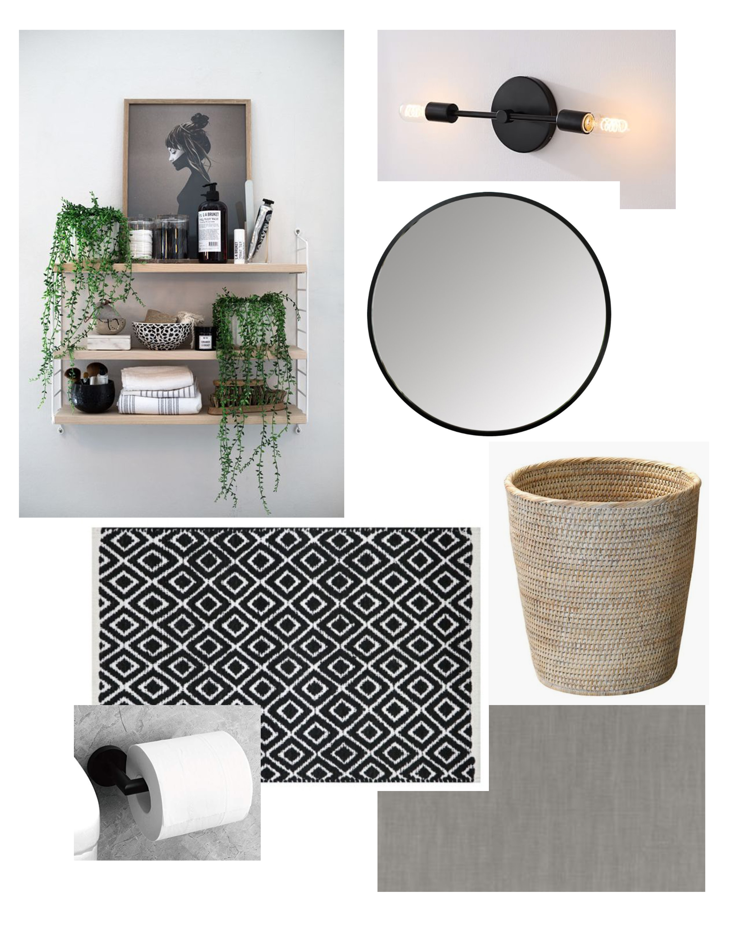 I took the mirror from our entry to replace over the existing vanity and it fits perfectly. With some online shopping, I ordered a simple light from West Elm, a shelf from Wayfair, an extra long linen shower curtain, and black hardware from Amazon. Lastly, a Target run pulled all the linens and final touches together.
