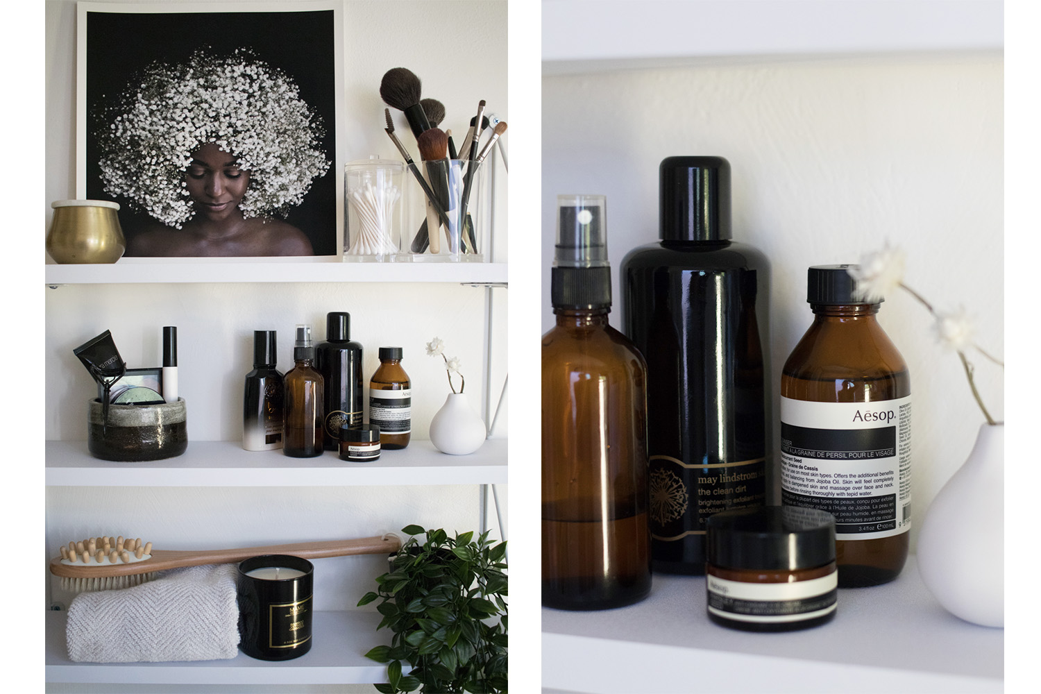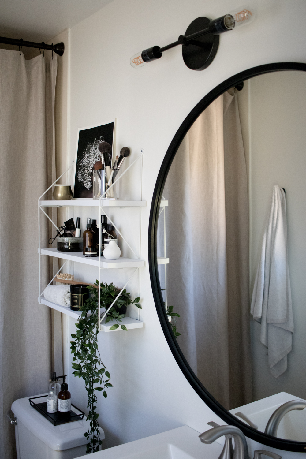 I love how the space feels now. I’m beyond happy the blue walls and blah mirror are gone. It feels so much brighter and cleaner. The fluffy white towels and linen shower curtain add a little bit of luxury to the space that otherwise lacks it. The black modernizes it enough and I can’t believe how happy that shelf makes me. I’m a skincare nut and seeing all the pretty bottles brings me so much joy. Do you want to know what made me even happier than that shelf though? A dimmer! Such a simple thing to install but it is so nice to brush my teeth in soothing dim light before bed.