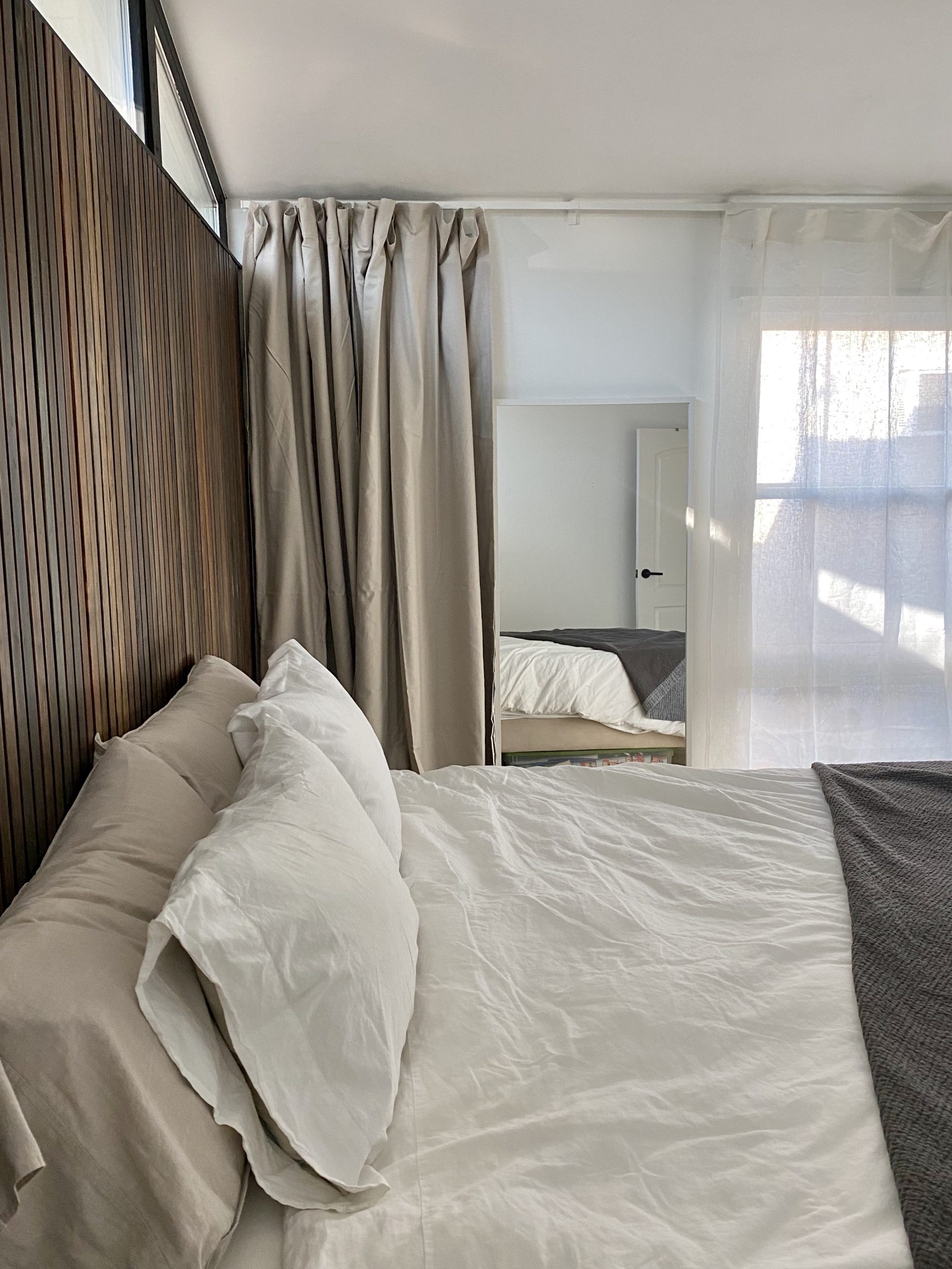 Lastly, IKEA finally re-opened and I ventured there to pick up the supplies I needed for the curtain wall. I went with the Vidga track system. Price point is great and I love how the curtains can slide all the way to each side with no bracket obstructing it’s path. It took a bit to get them hung with measuring and trimming the rail down but it’s relatively simple. Putting the tiny clips on the curtain panels was the most time consuming. I snapped a quick photo before I took them down to hem. Once they were up I also realized I needed way more hanging clips to create the look I’m going for. They sag a bit now. So it’s back to IKEA for 2 more bags of $3 clips.