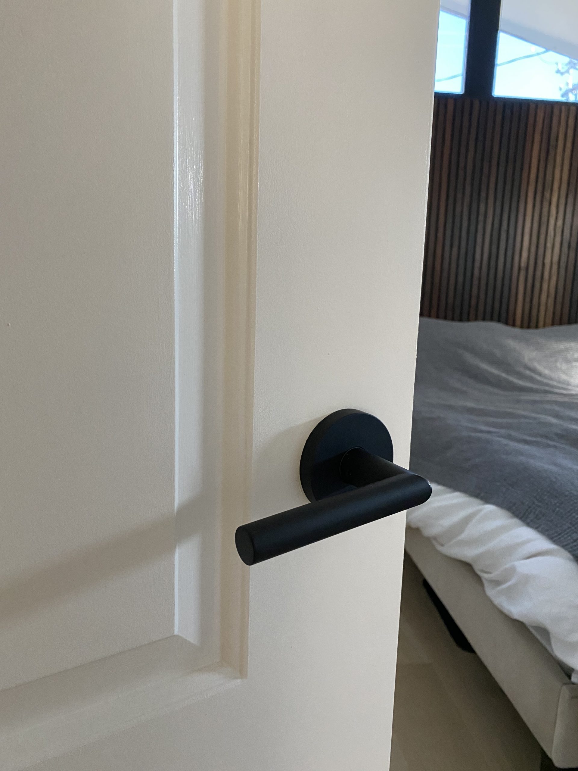 The bedroom door got a fresh coat of paint as it was in rough shape. I sprayed the hinges flat black and changed out the handle hardware to coordinate with the rest of the house. The bedroom doors have been the last to get that refresh.