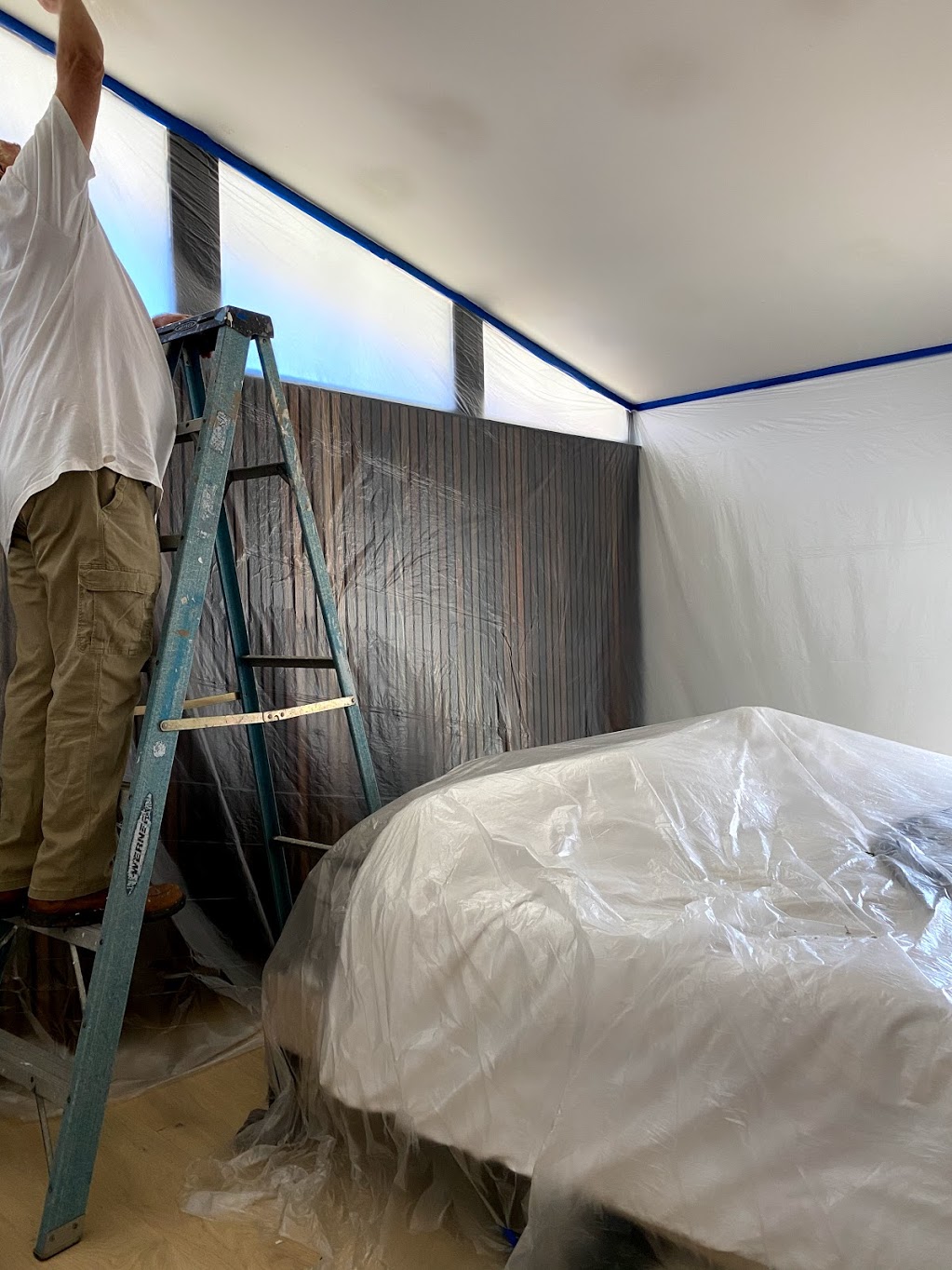The bedroom walls had recently been painted in Dunn Edwards Whisper in their velvet sheen, so just a bit of touch up was needed to cover nail holes and marks. I was hoping to avoid having to paint the ceiling but the patches where we had insulation blown in were VERY noticeable. They had done a light spray of paint but it just never covered well. As I attempted to give it another coat I realized this was a much more involved job and that spot sanding, priming, and painting the whole ceiling would need to be done to make it look right.
