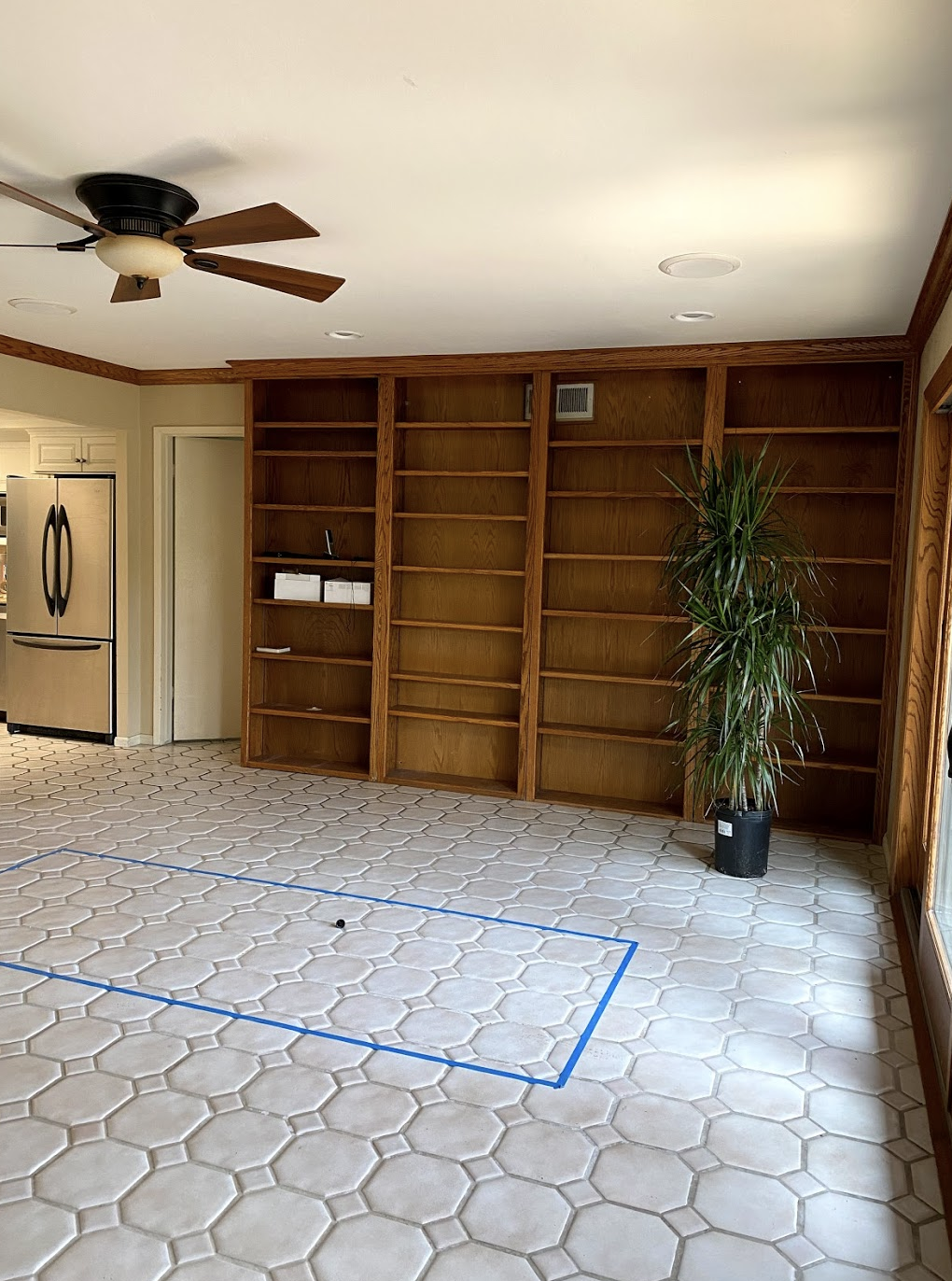 My plan for the room is to create a conversation area and a cozy but swanky lounge vibe. As far as demo I will be removing the crown molding to honor the architecture of the home better but plan to keep the built in bookshelves. They will make for some good styling moments. Surprisingly I like the tile floors and plan to keep them through the phase 1 reno of the whole house. They are in good shape except for some stained grout in the kitchen and some of the lounge which I plan to remedy at a later date. It will be a nice neutral floor for this challenge.