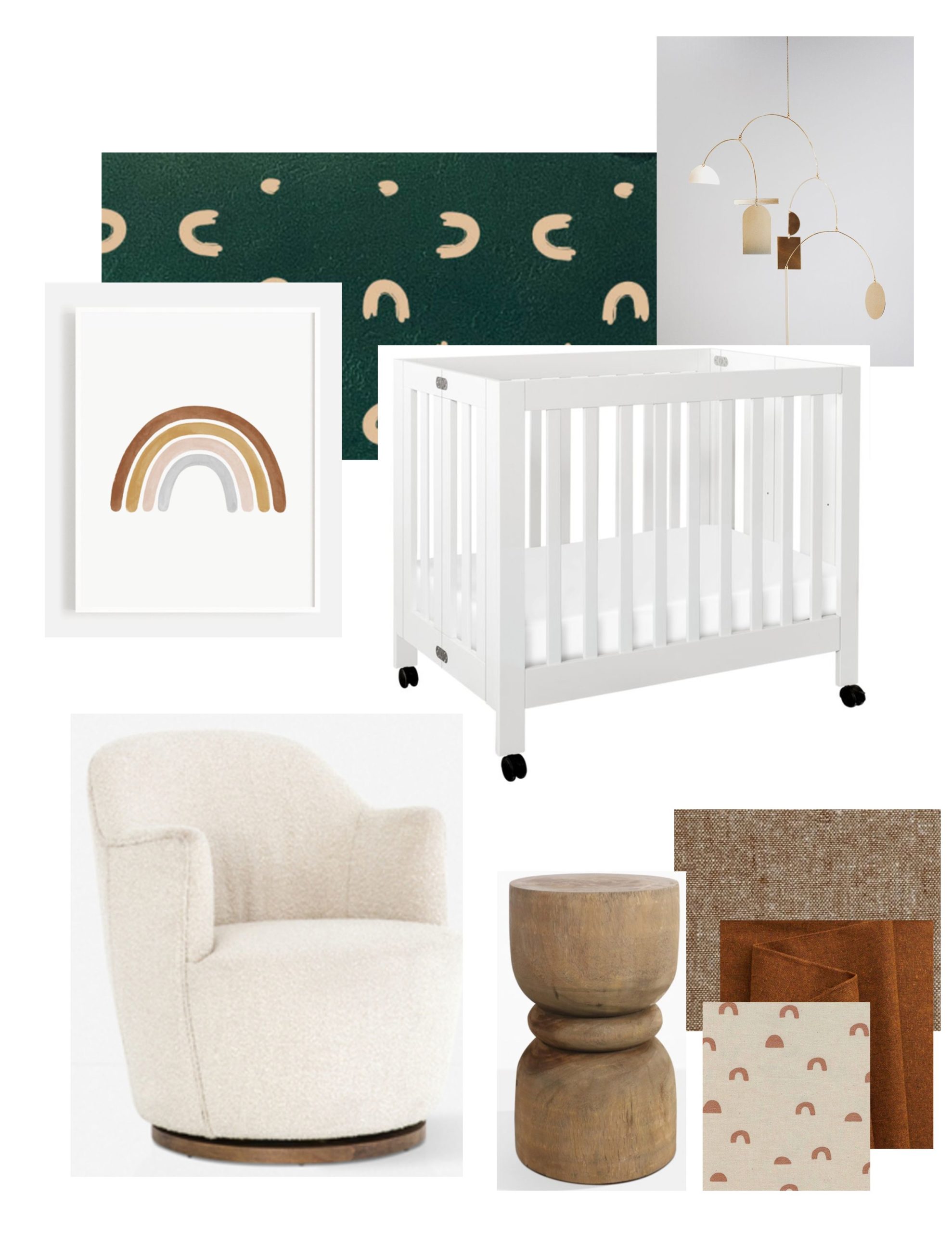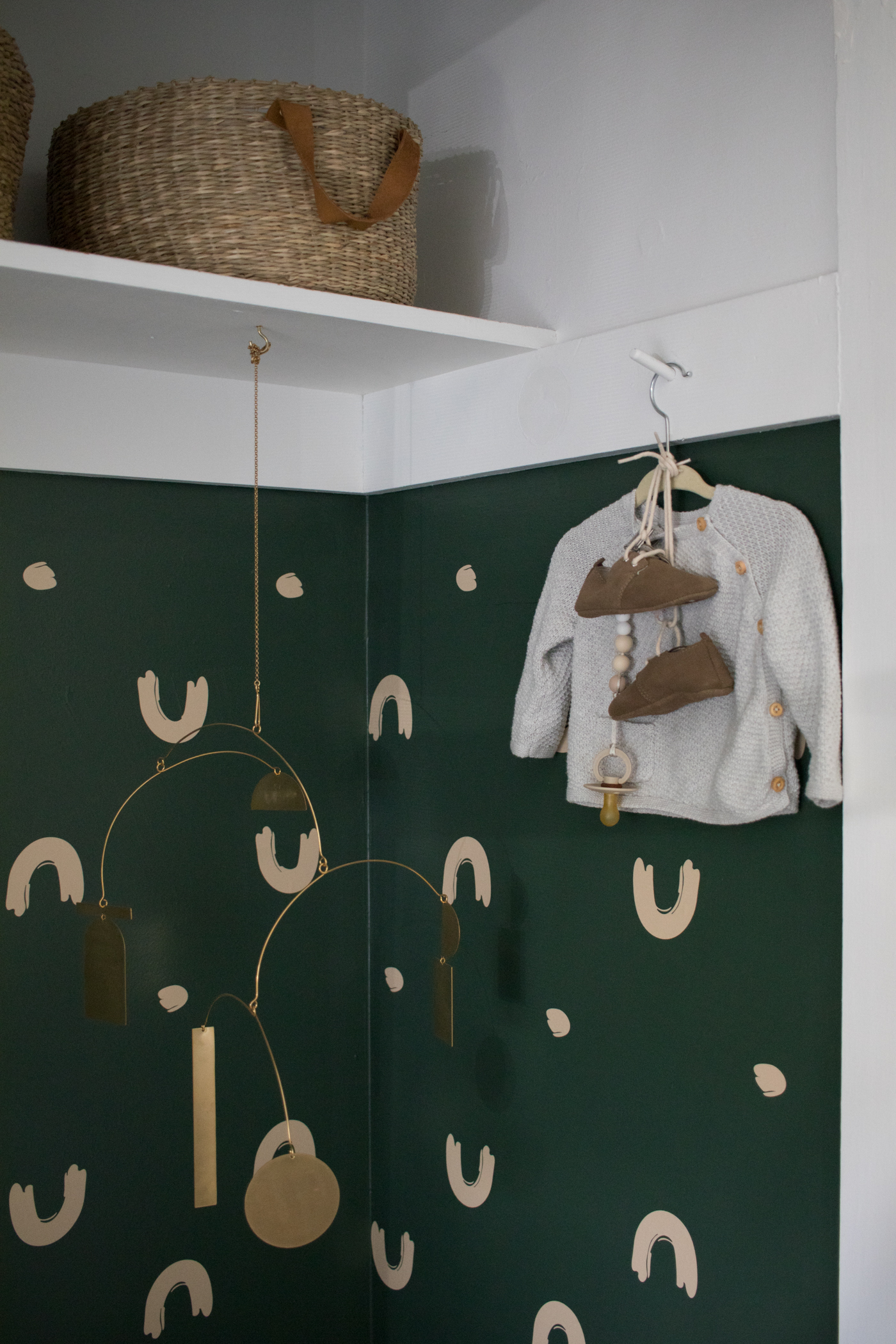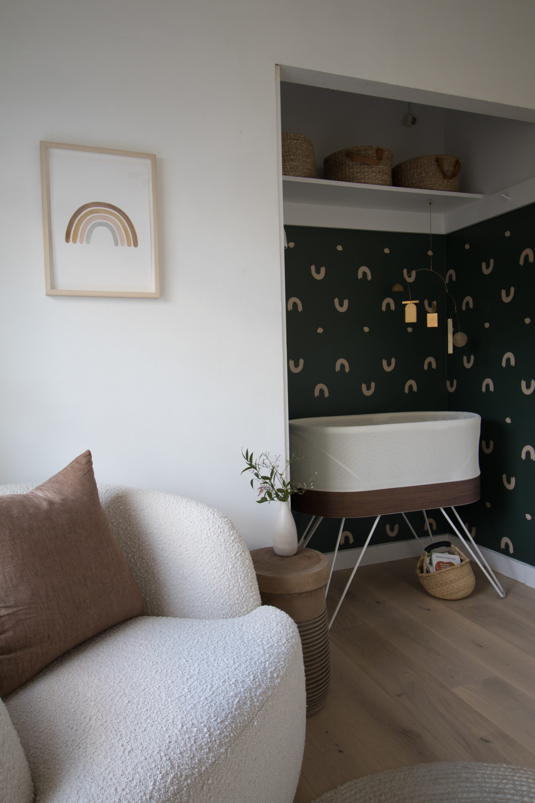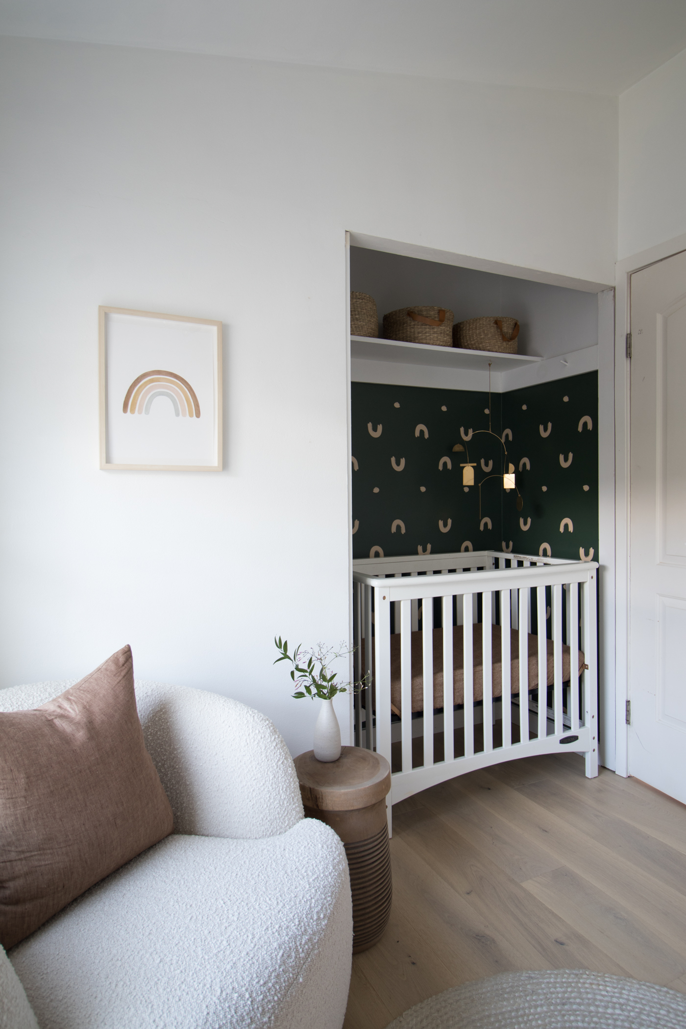 I wanted to make the new co-sleeping nook a little space of it’s own so I painted the walls a deep green. The color is Coriander and Olive by Sherwin Williams. I had snagged the rainbow wall print from Rylee + Cru and with that the arches started to play a part in the design.