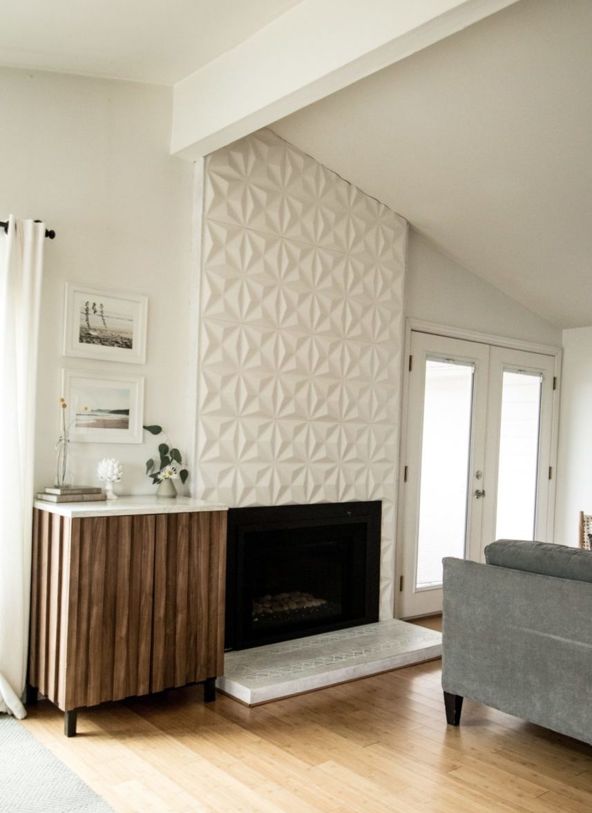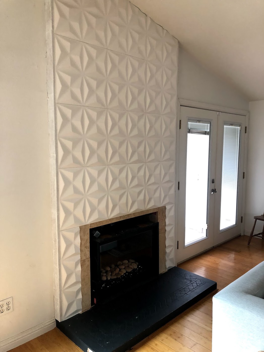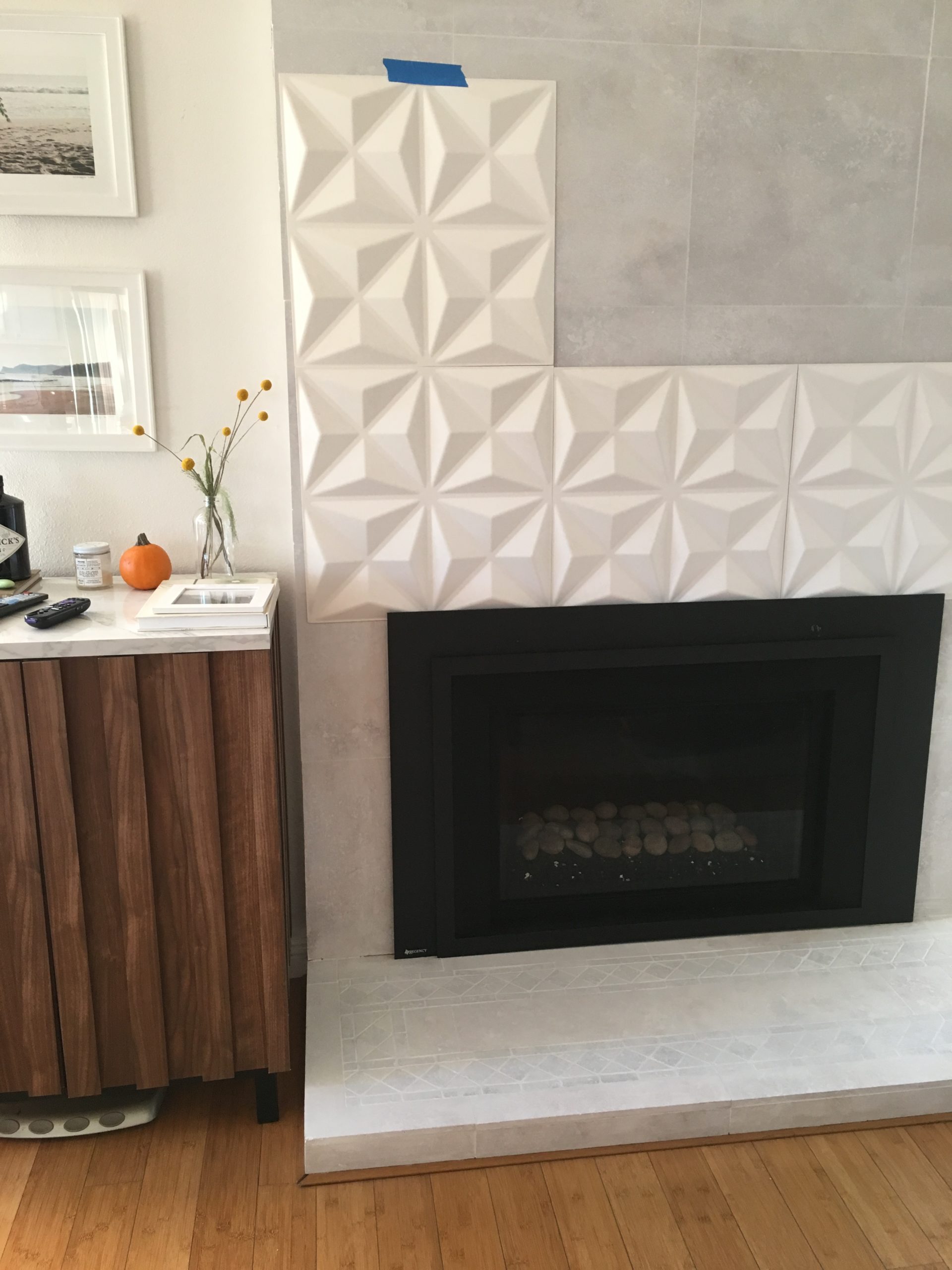 These 3D Wall panels are made from molded sugar cane pulp. Free of chemicals and VOC’s it was such a unique option. The panels were lightweight and came in boxes of 12 in a 20” x 20” dimension. I removed the mantel for a modern look and then determined the best way to install the panels over the existing tile.