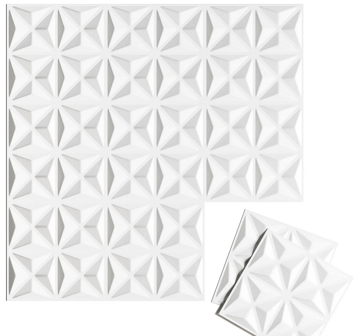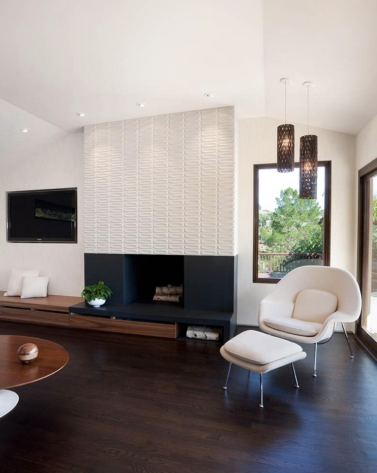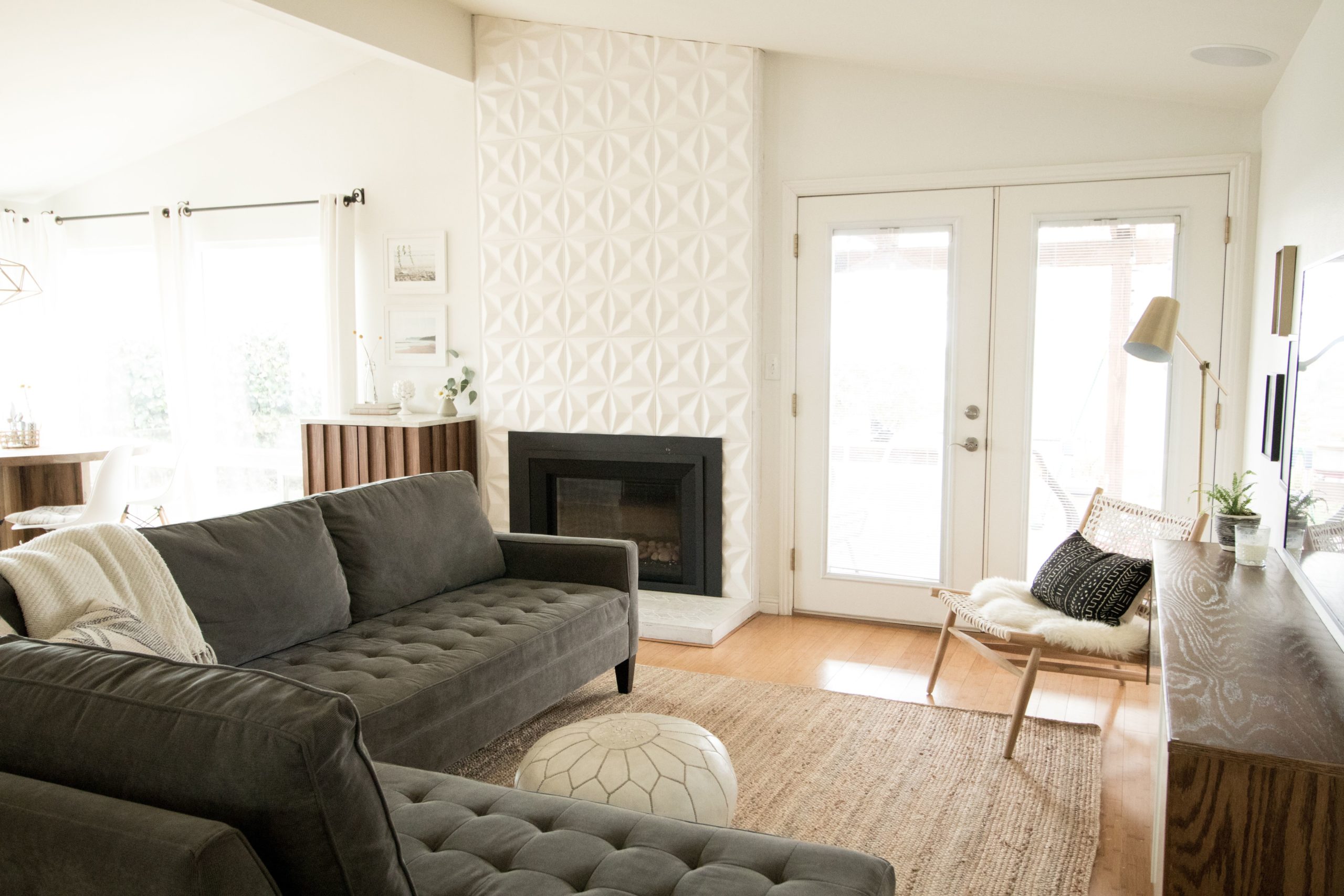 These 3D Wall panels are made from molded sugar cane pulp. Free of chemicals and VOC’s it was such a unique option. The panels were lightweight and came in boxes of 12 in a 20” x 20” dimension. I removed the mantel for a modern look and then determined the best way to install the panels over the existing tile.