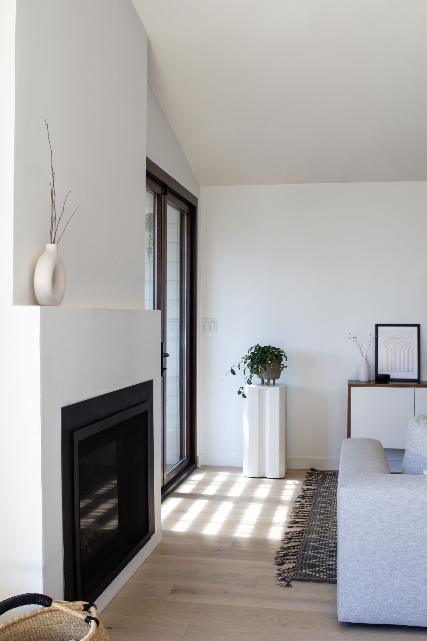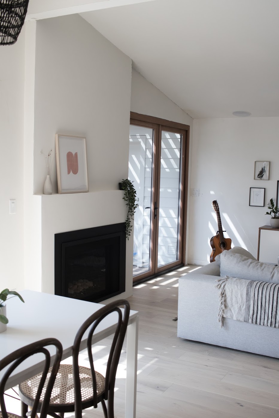 Now 8 years into owning this home I knew it was time for a full makeover. We decided to do a big refresh on our main living space. Replacing our floors and adding La Cantina bifold doors to the back of the house. This was the perfect time to remove the fireplace step and frame the fireplace to have a modern built in mantle. Because we changed from wood burning to a fully enclosed gas one the brick/tile step barrier was no longer needed for fire code.