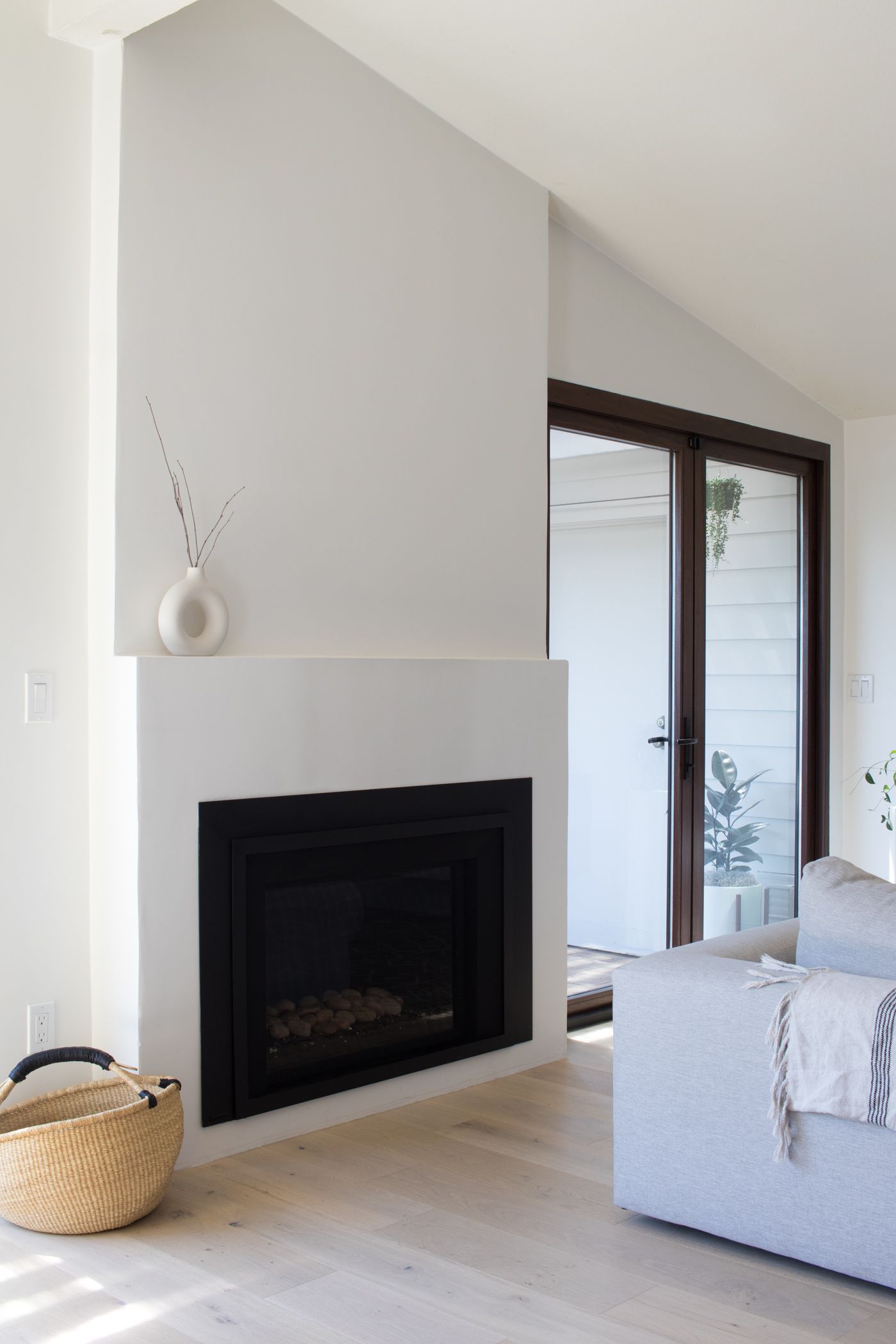 Another stunning modern and smooth fireplace inspo was this one by Carol Estes. The texture and way the light moved across it really stood out to me. It is a gorgeous addition to her sophisticated, neutral home. This look was achieved with a Santa Barbara smooth stucco finish. This is an option I found much easier to find skilled people to do. Especially here in Southern California where many houses are stucco.