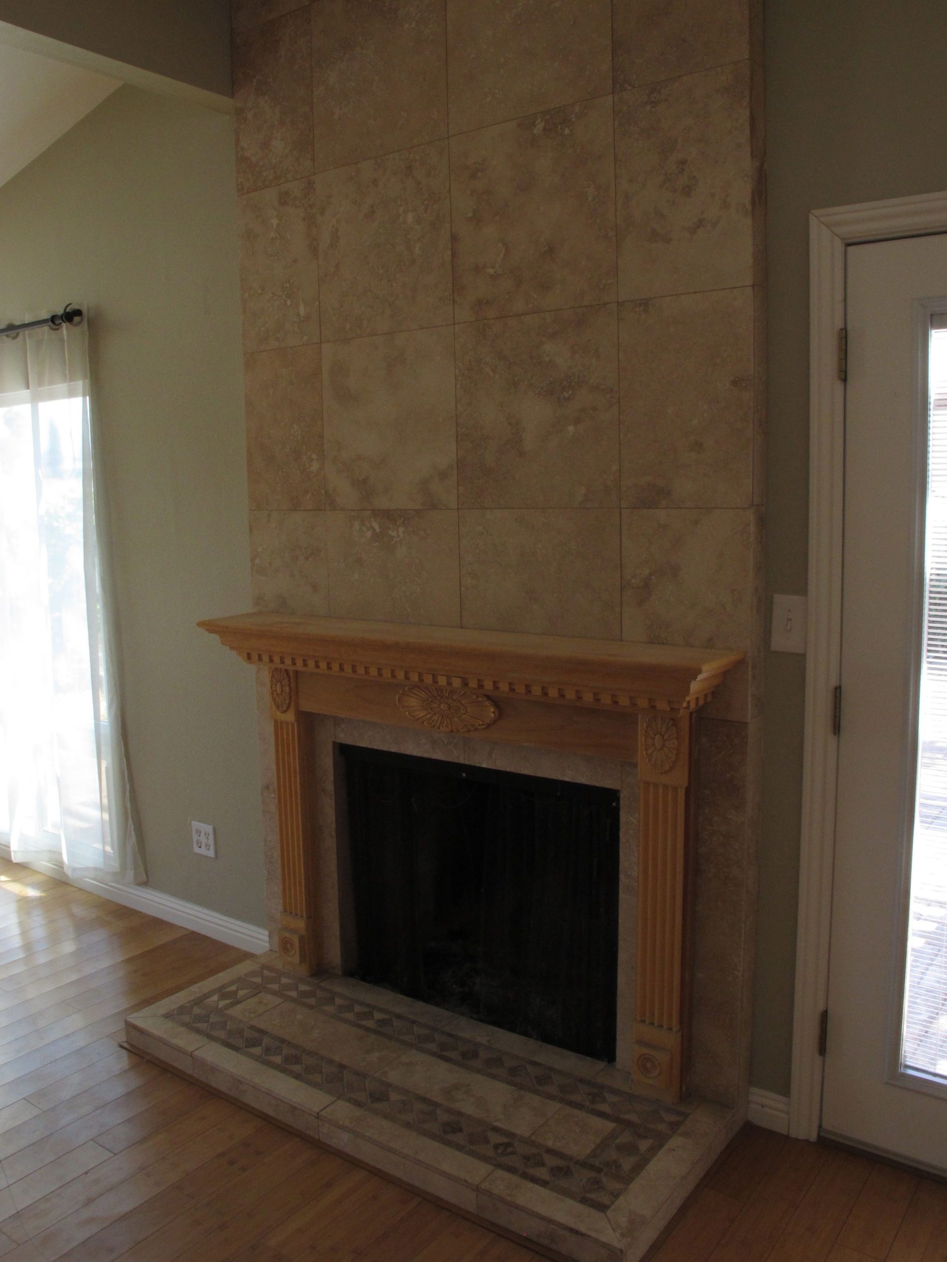 We started by removing the gas fireplace surround. You can see from this view the travertine tile underneath.