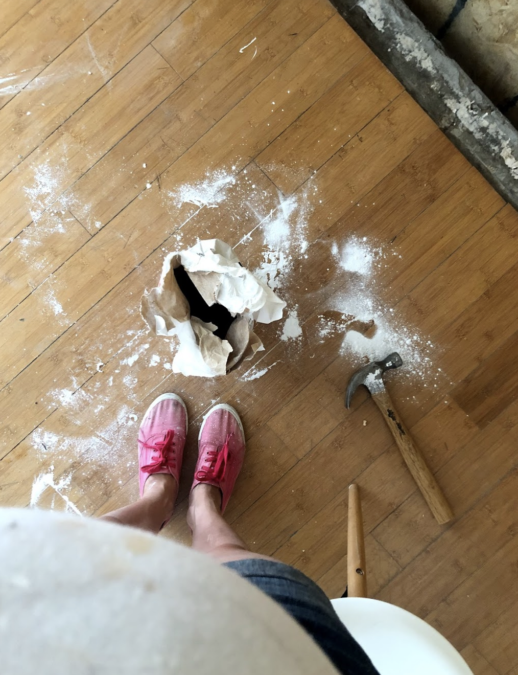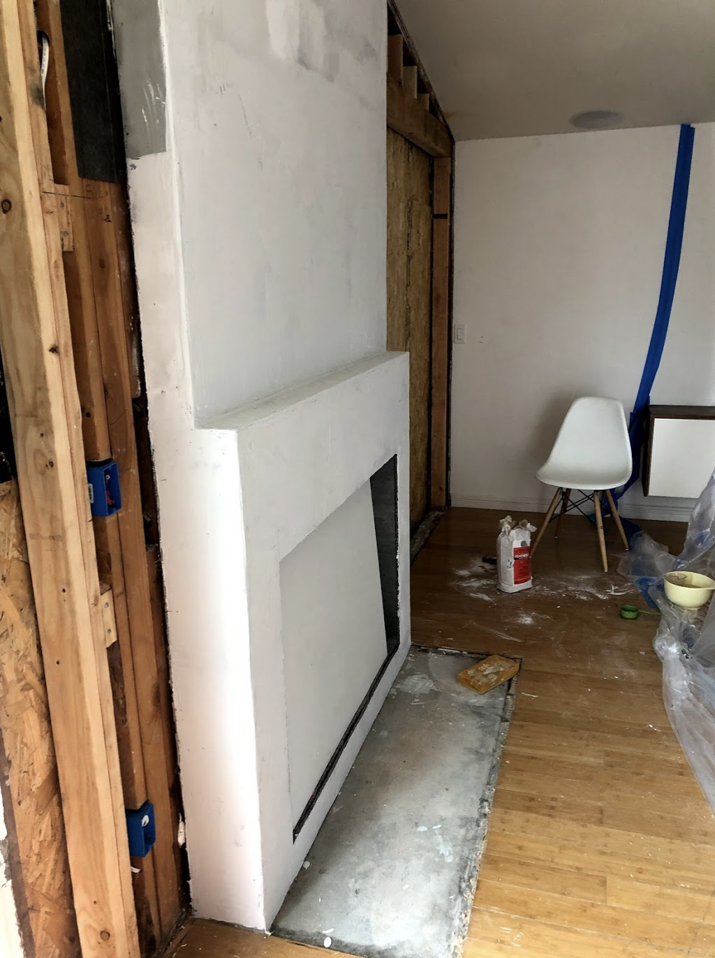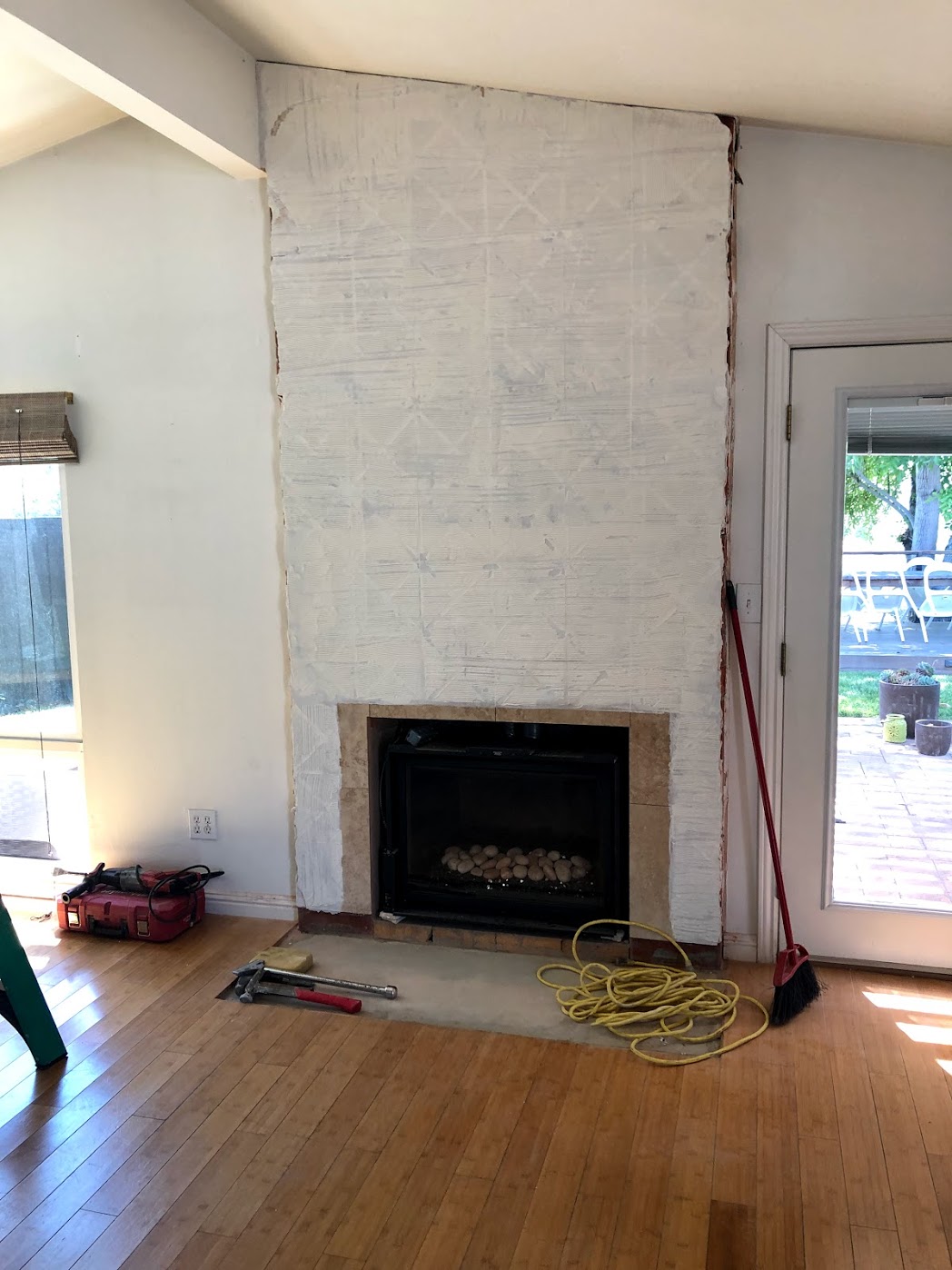 Next we scraped off the Inhabit wall panels which were an easy demo and broke up the tile and brick step. I instantly loved having that step gone! I wish I had done it years ago and just did a coordinating tile flush with the floors. Hindsight I tend to wait for the full renovation but these phase 1 fixes can go a long way too. The plan was to remove the travertine tile as well but as we started to attempt that it was causing a lot of damage to the brick underneath. Our contractor was worried about the integrity of the fireplace at this point so we made the decision to install cement hardie board right over top and work with what we already had. It changed the finish depth off the wall only by a small amount.