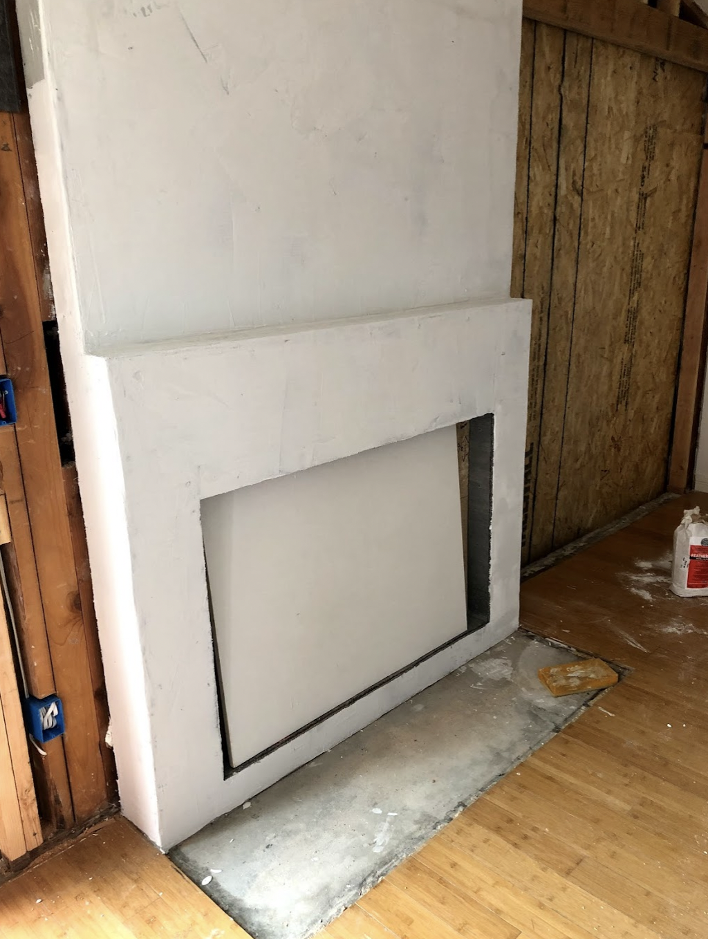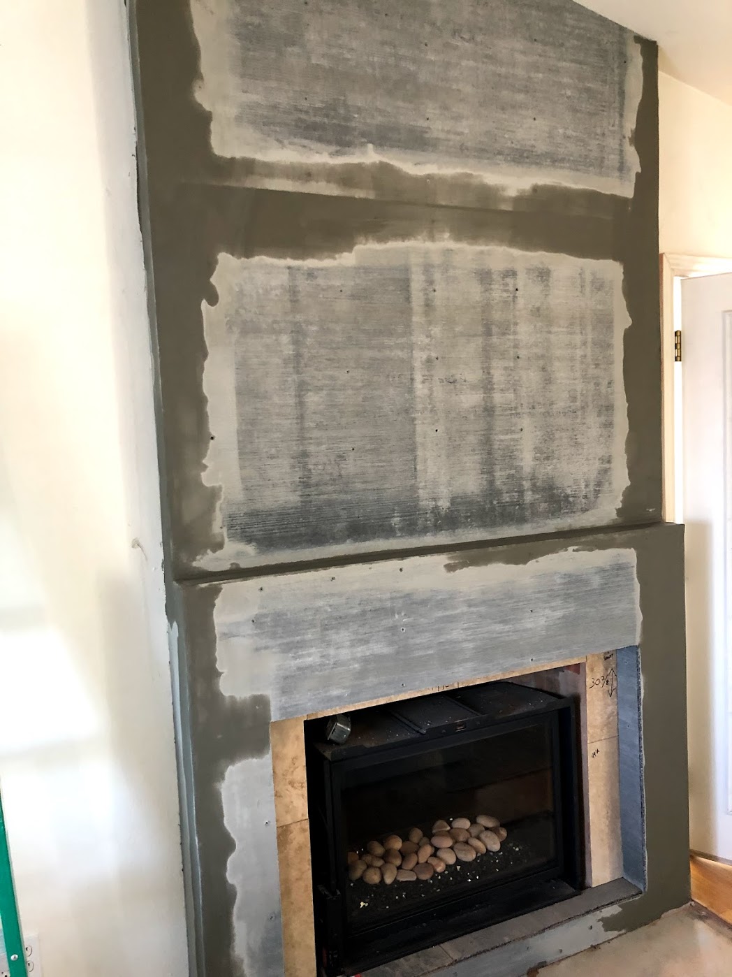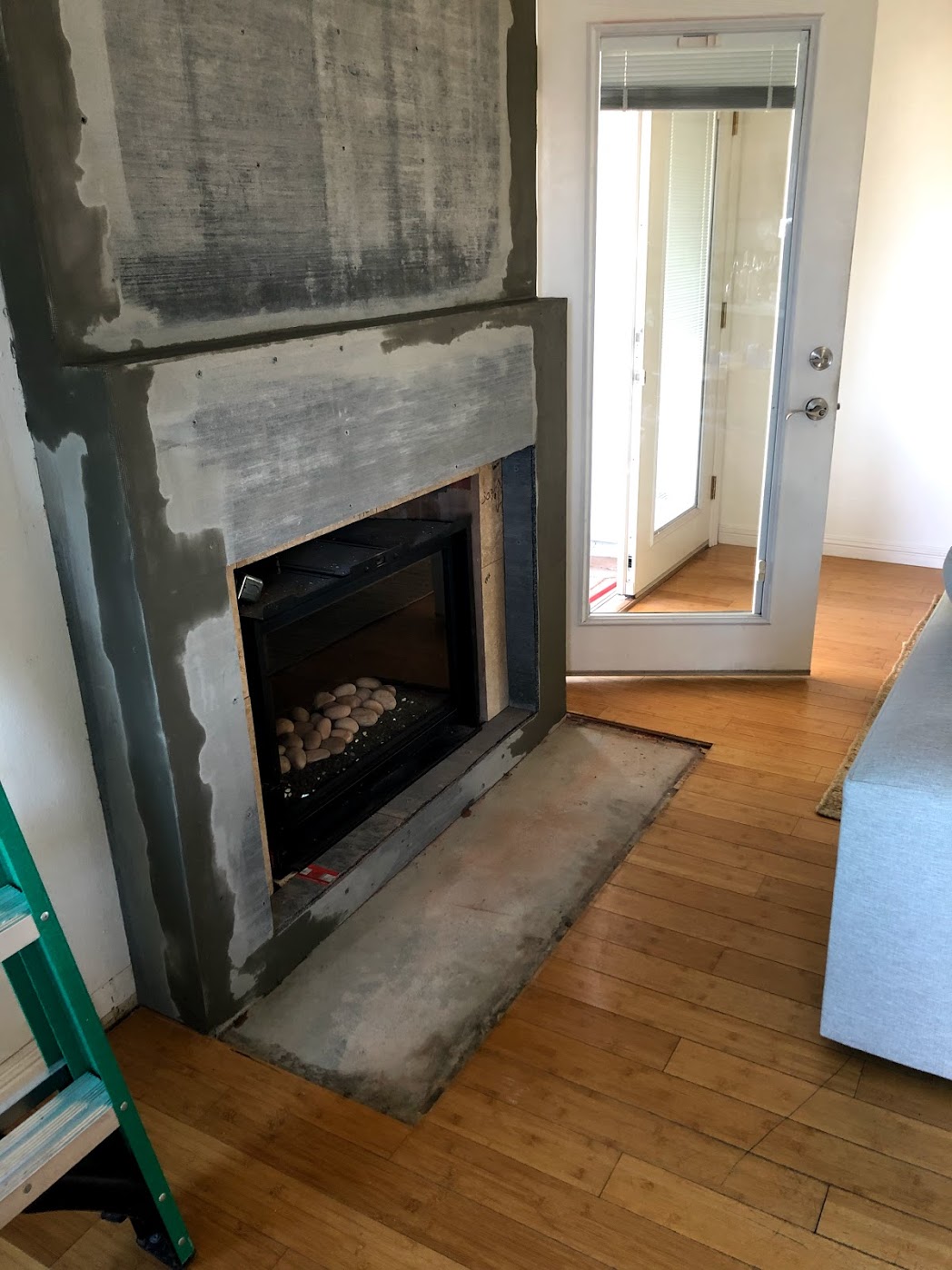 I almost completed one coat of the Ardex feather light concrete finish in white. I chose this product over plaster as I thought it would be easier to work with. In hindsight I may have just gone to my local big box store grabbed some plaster off the shelf and attempted it first. The Ardex product is expensive for a small bag. I have since used it for a coffee table project and loved the results. The 2 things that were different, I used warm water instead of cold and applied it flat as opposed to vertical. The consistency was more like batter where as with the fireplace I couldn’t get it to stop turning into glue, then rock solid withing 1 minute. It was drying up way too fast to be workable and ended up being impossible to deal with. I realized real quick I wasn’t going to see this project through without help.